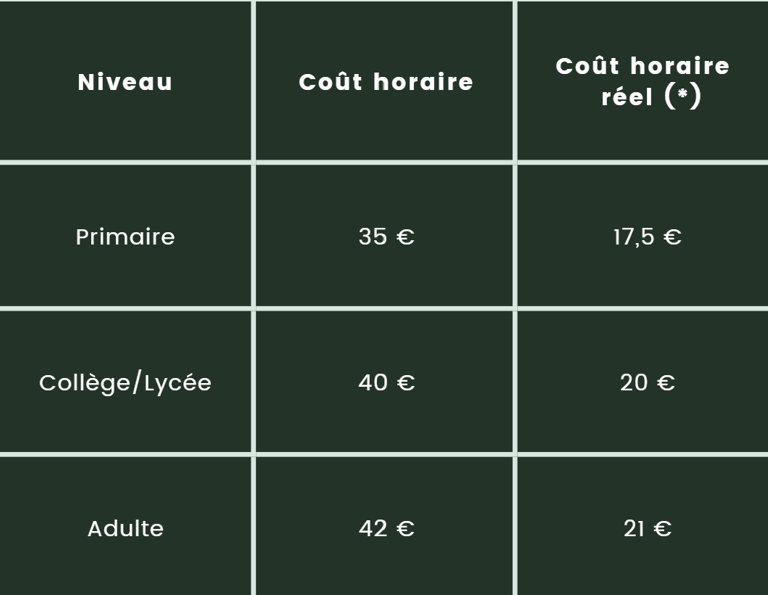 Le coût horaire est donc divisé par deux après déduction fiscale. Une facture regroupant les différentes prestations réalisées vous sera fournie en prévision de votre déclaration d'impôt.